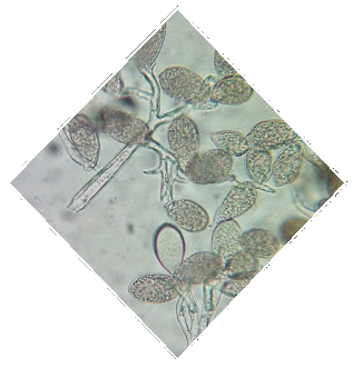 تبدأ الجراثيم الساكنه في النمو في الظروف الملائمه منخفضة الحرارة مرتفعة الرطوبه مكونة جراثيم تنتقل الى النباتات عن طريق الرياح والمياة وتصيب الاوراق وتبدأ في الاصابه مكونة انبوب انبات مكونة ميسيليوم يخرج من فتحات الثغور حاملا اكياس جرثوميه تنقسم في الظروف المناسبه وتخرج منها الجراثيم لتعيد الاصابه وفي الظروف الغير مناسبه يحدث التكاثر الجنسي مكونات اسبورات يمكنها البقاء 4-5 سنوات حتى تجد العائل.